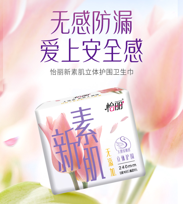 为了带给女性高品质的舒适体验,“怡丽”品牌始终坚持无荧光,无香精,对肌肤零刺激的理念,致力于纯净无添加的个人护理产品体验。